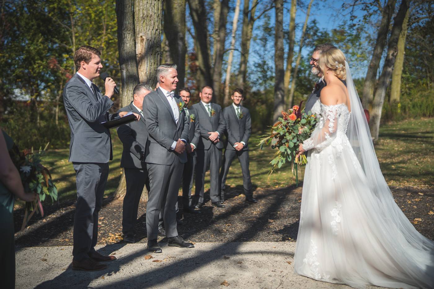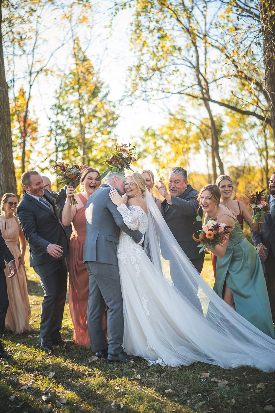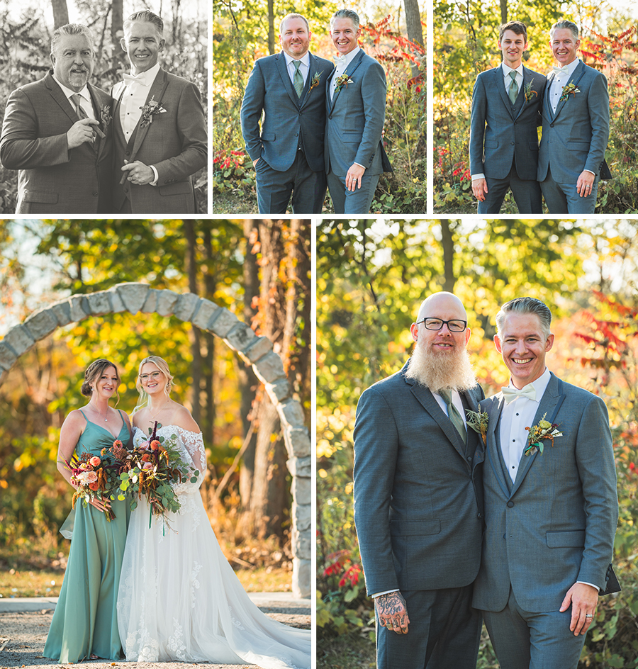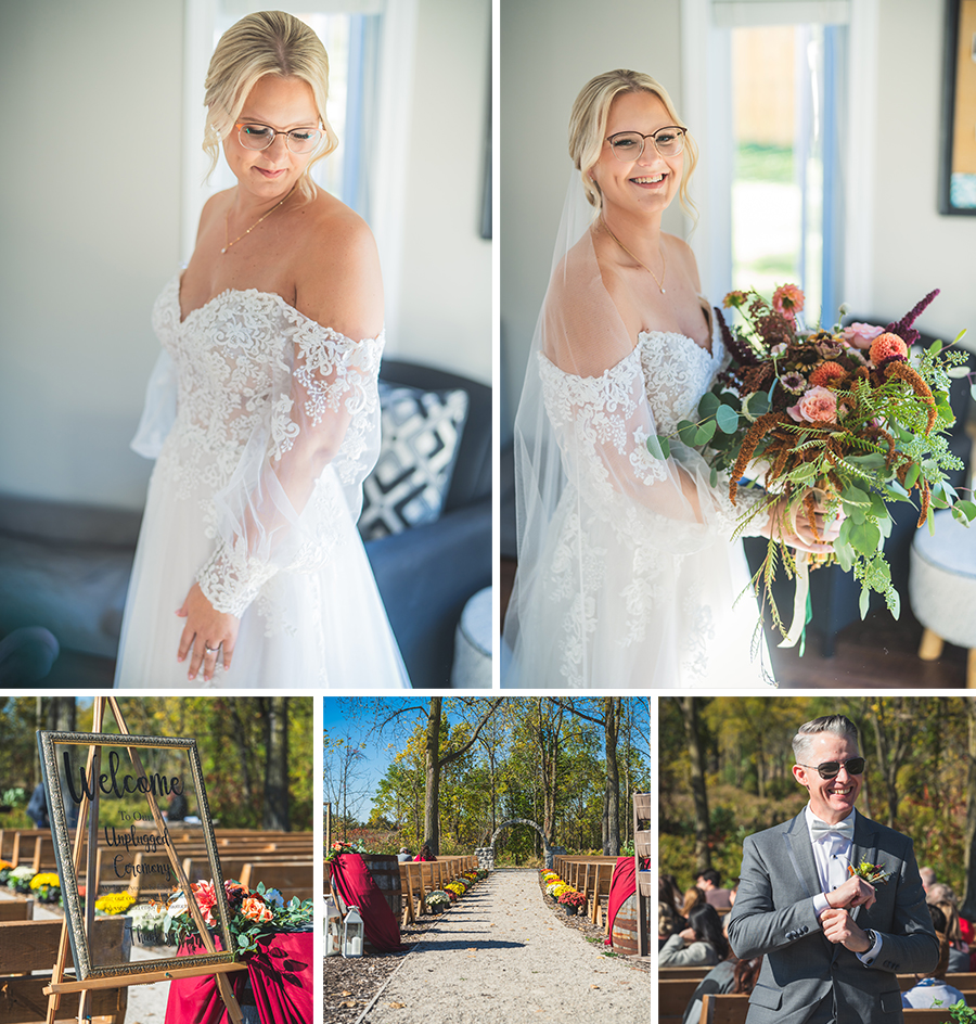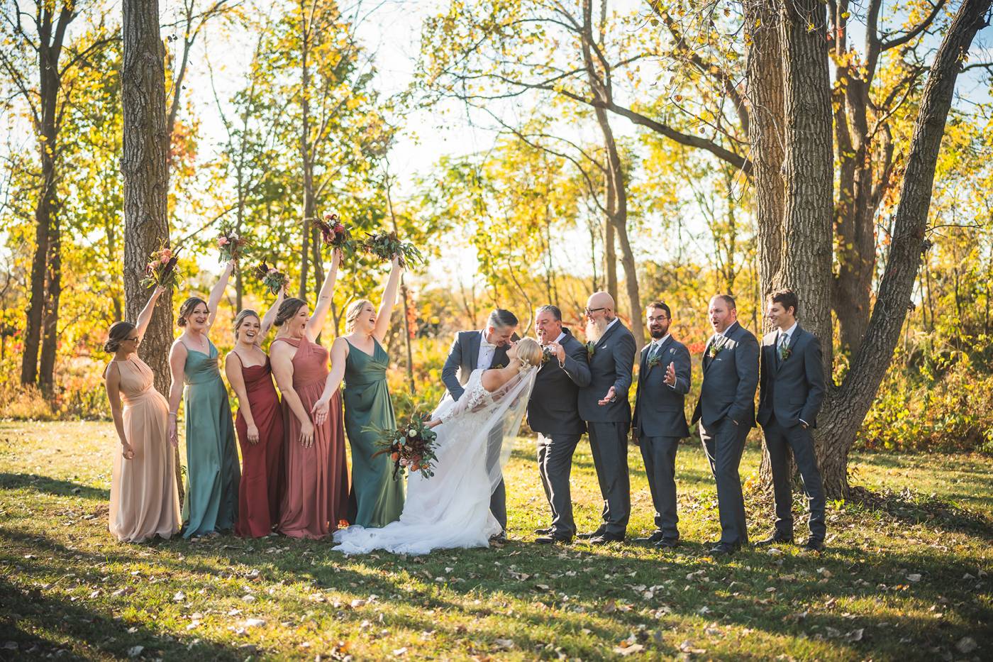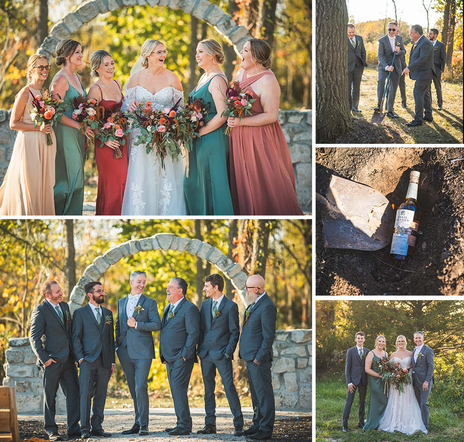 The outdoor ceremony, surrounded by the breathtaking colors of autumn, was made even more special with Kristina’s brother officiating. It was a picturesque scene, the warm sun casting a glow over the couple as they exchanged vows with their friends and family as witnesses. After the ceremony, the newlyweds took time for family photos and fun wedding party shots on the Timber Ridge property. In a unique and charming tradition, the groomsmen unearthed a bottle of whiskey they had buried a month before—a ritual meant to ensure good weather for the wedding, which turned out perfectly!