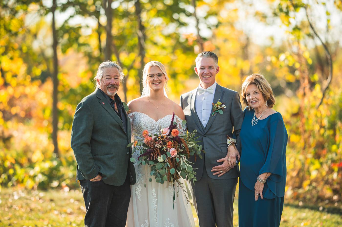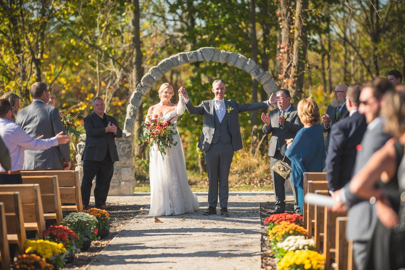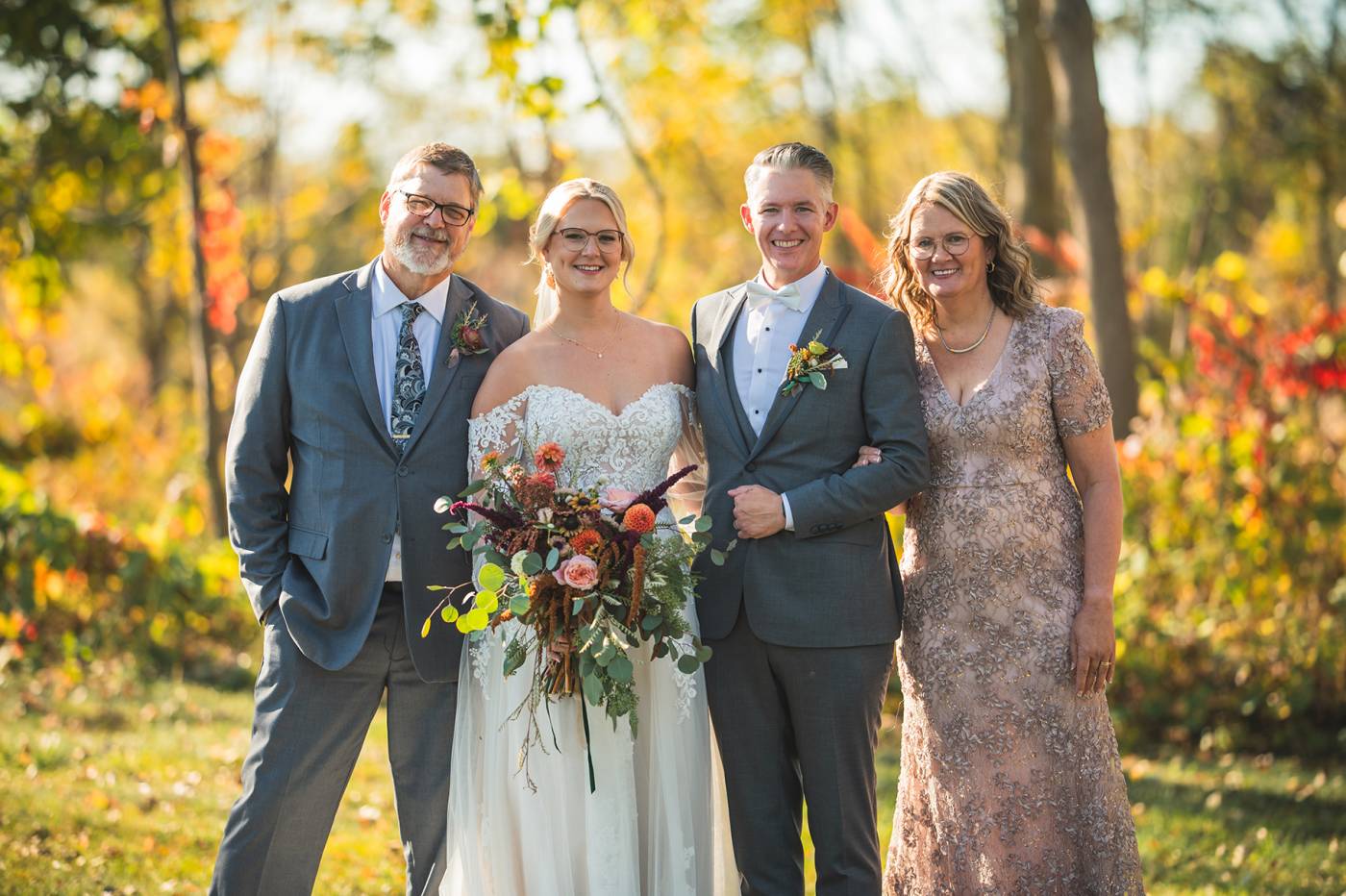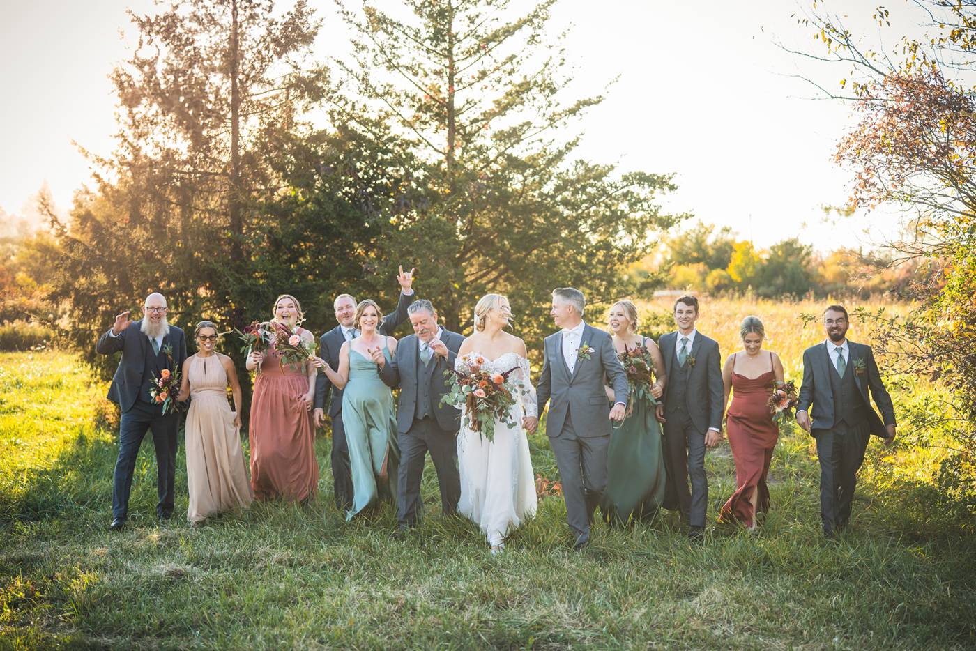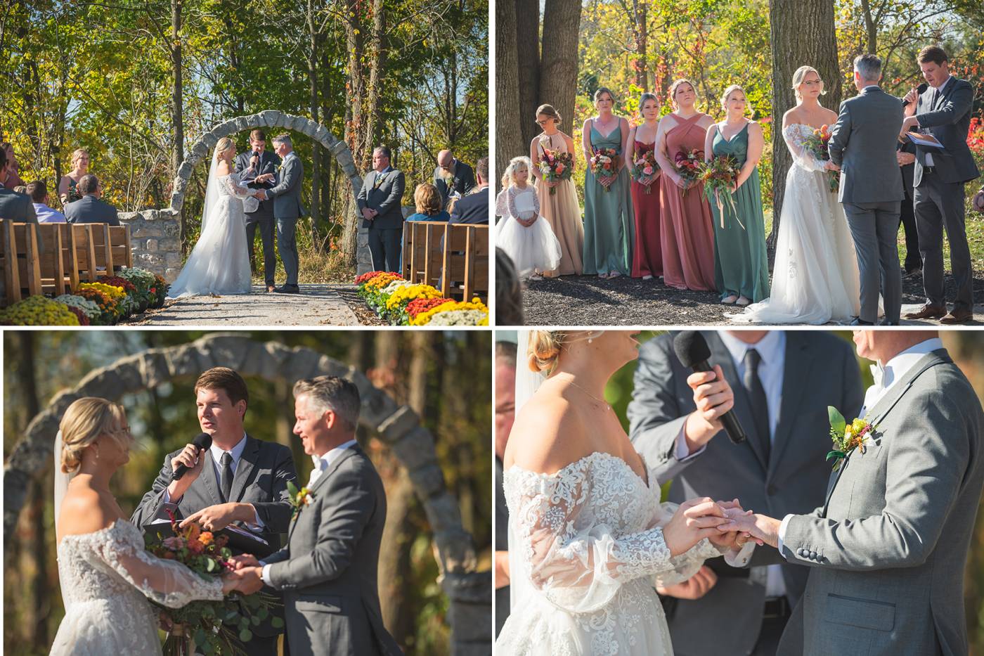The outdoor ceremony, surrounded by the breathtaking colors of autumn, was made even more special with Kristina’s brother officiating. It was a picturesque scene, the warm sun casting a glow over the couple as they exchanged vows with their friends and family as witnesses. After the ceremony, the newlyweds took time for family photos and fun wedding party shots on the Timber Ridge property. In a unique and charming tradition, the groomsmen unearthed a bottle of whiskey they had buried a month before—a ritual meant to ensure good weather for the wedding, which turned out perfectly!
