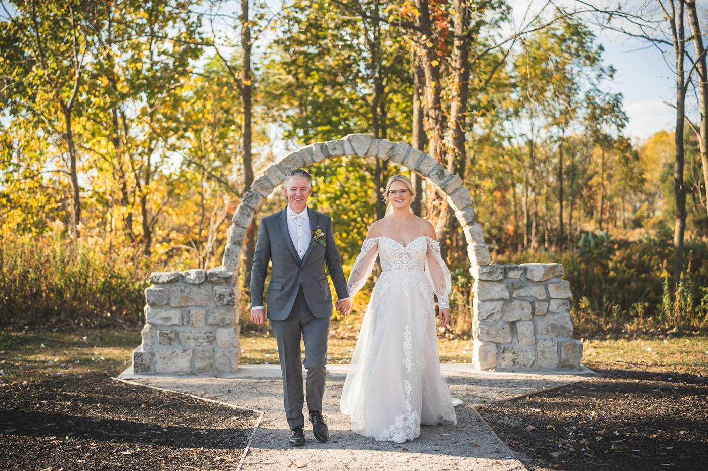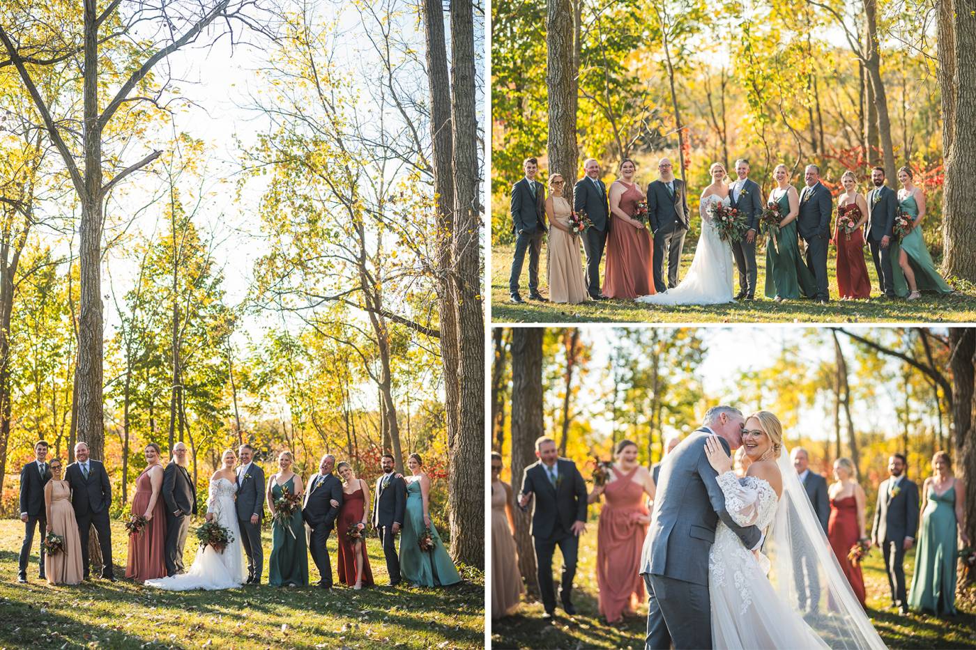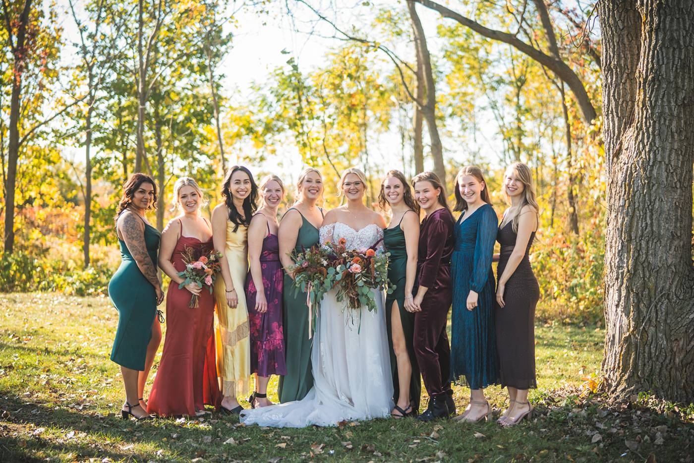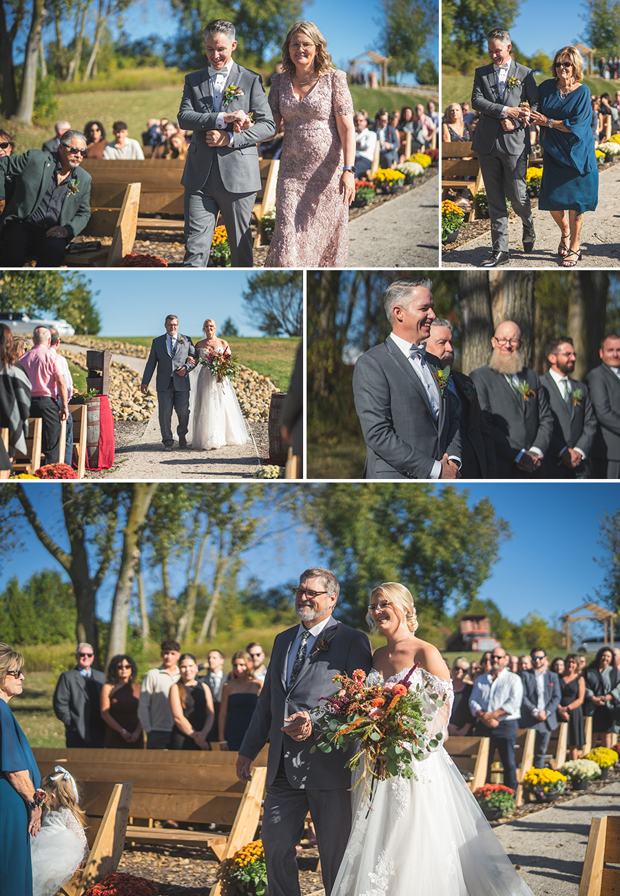 The outdoor ceremony, surrounded by the breathtaking colors of autumn, was made even more special with Kristina’s brother officiating. It was a picturesque scene, the warm sun casting a glow over the couple as they exchanged vows with their friends and family as witnesses. After the ceremony, the newlyweds took time for family photos and fun wedding party shots on the Timber Ridge property. In a unique and charming tradition, the groomsmen unearthed a bottle of whiskey they had buried a month before—a ritual meant to ensure good weather for the wedding, which turned out perfectly!