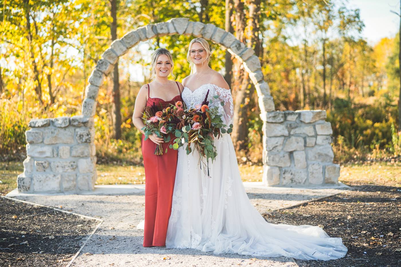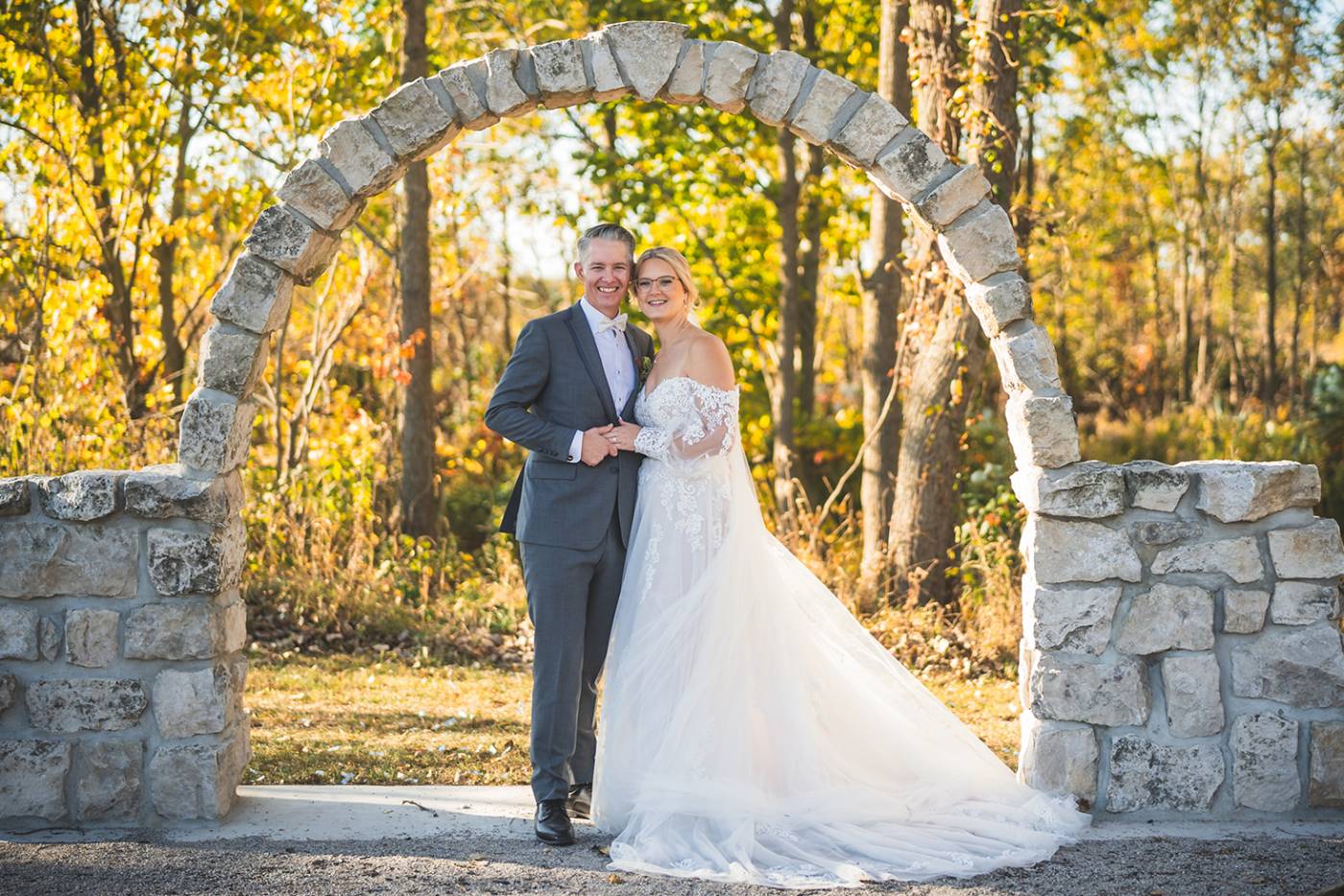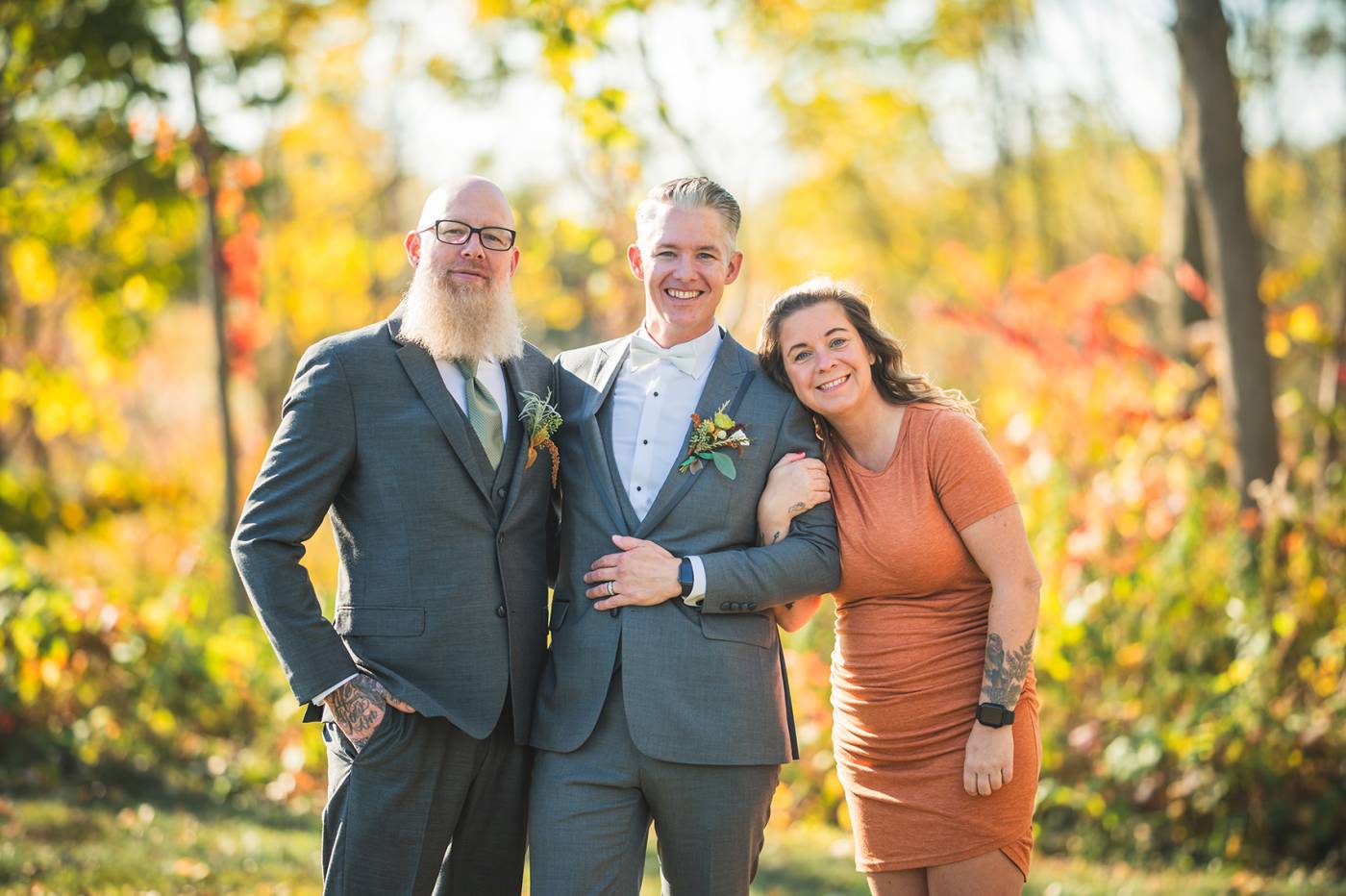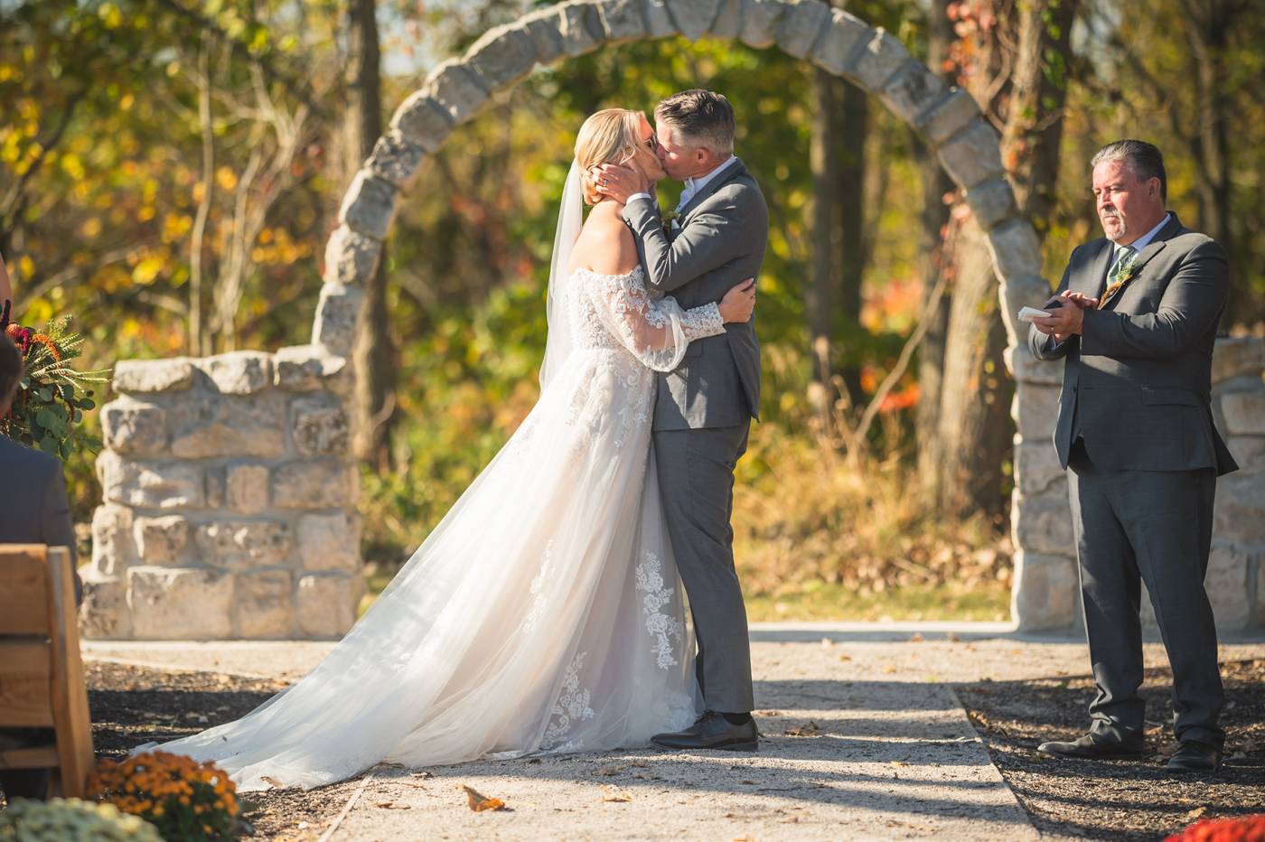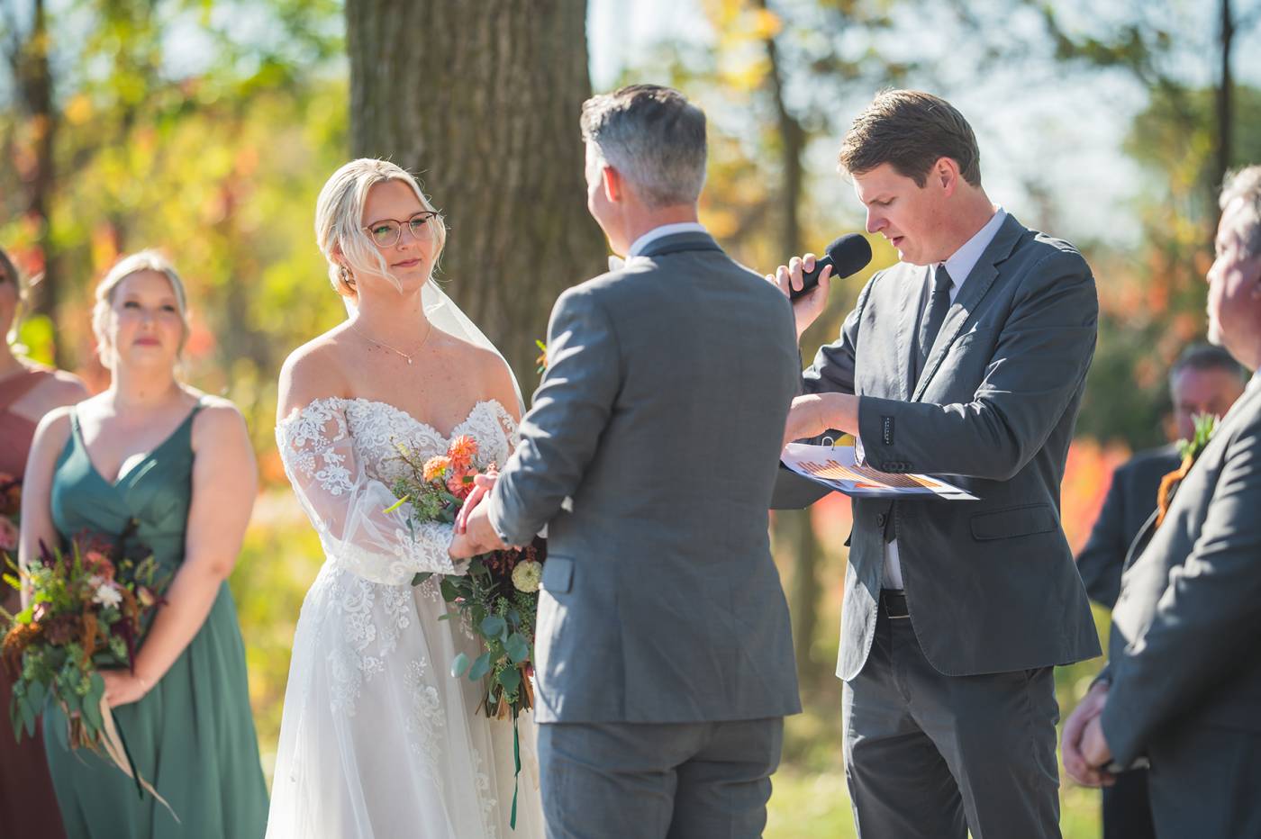 The outdoor ceremony, surrounded by the breathtaking colors of autumn, was made even more special with Kristina’s brother officiating. It was a picturesque scene, the warm sun casting a glow over the couple as they exchanged vows with their friends and family as witnesses. After the ceremony, the newlyweds took time for family photos and fun wedding party shots on the Timber Ridge property. In a unique and charming tradition, the groomsmen unearthed a bottle of whiskey they had buried a month before—a ritual meant to ensure good weather for the wedding, which turned out perfectly!