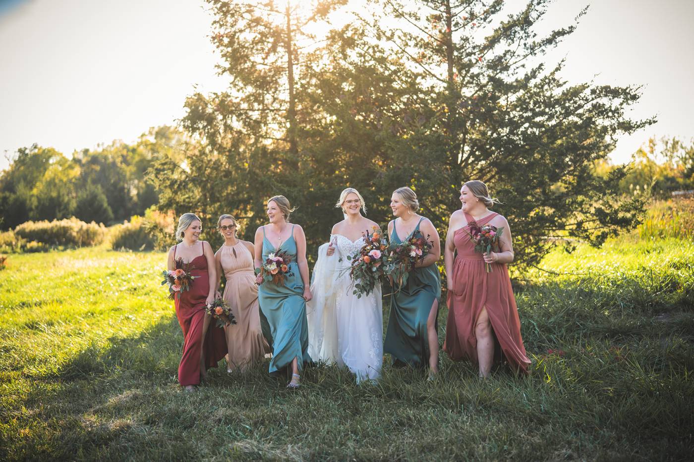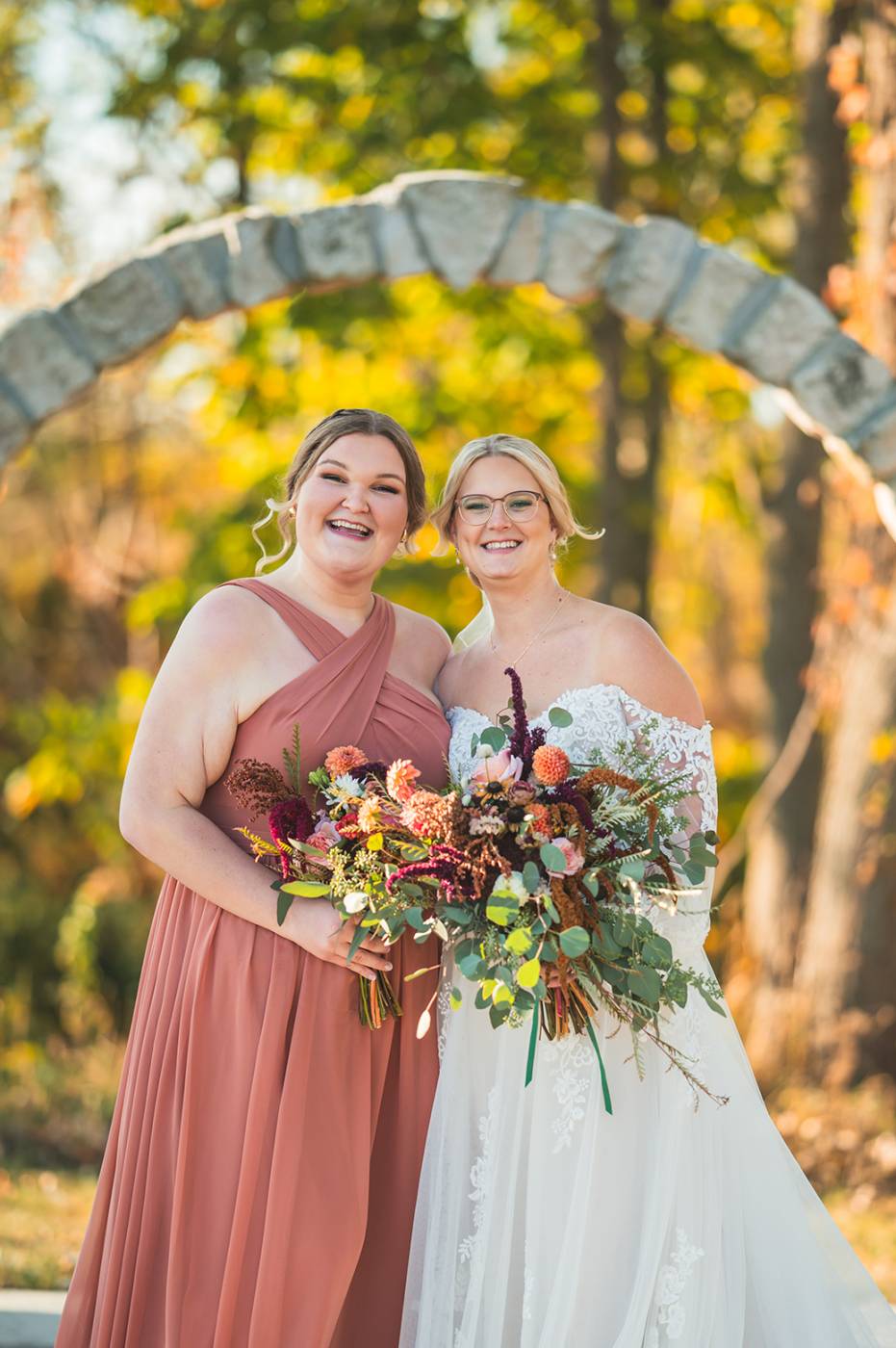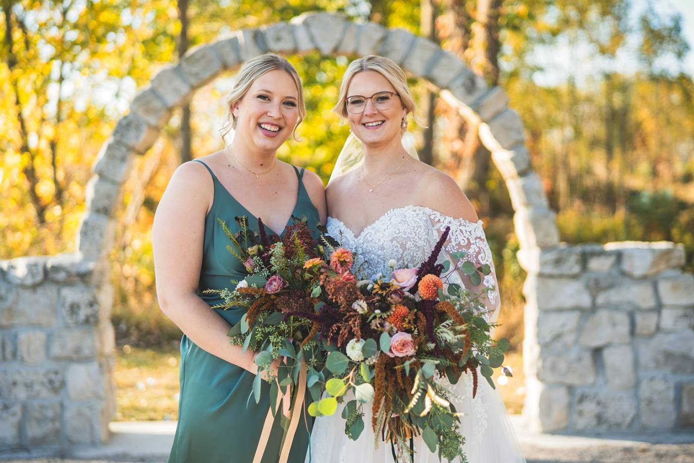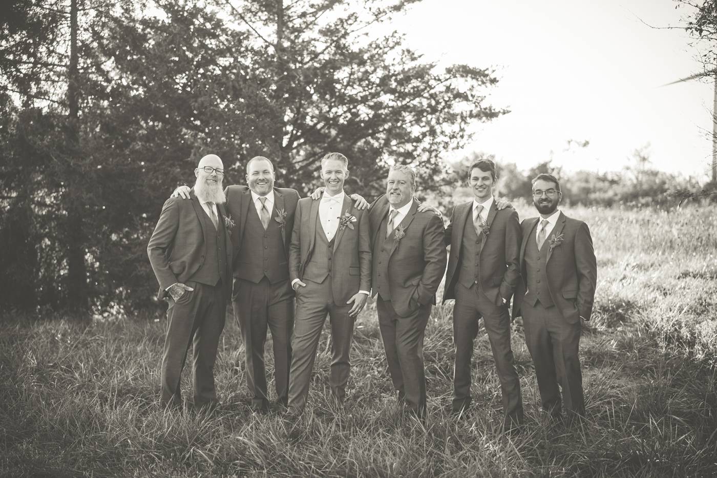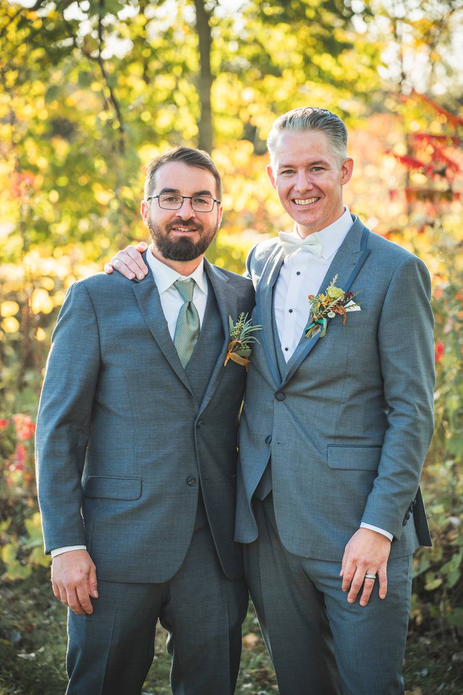 The outdoor ceremony, surrounded by the breathtaking colors of autumn, was made even more special with Kristina’s brother officiating. It was a picturesque scene, the warm sun casting a glow over the couple as they exchanged vows with their friends and family as witnesses. After the ceremony, the newlyweds took time for family photos and fun wedding party shots on the Timber Ridge property. In a unique and charming tradition, the groomsmen unearthed a bottle of whiskey they had buried a month before—a ritual meant to ensure good weather for the wedding, which turned out perfectly!