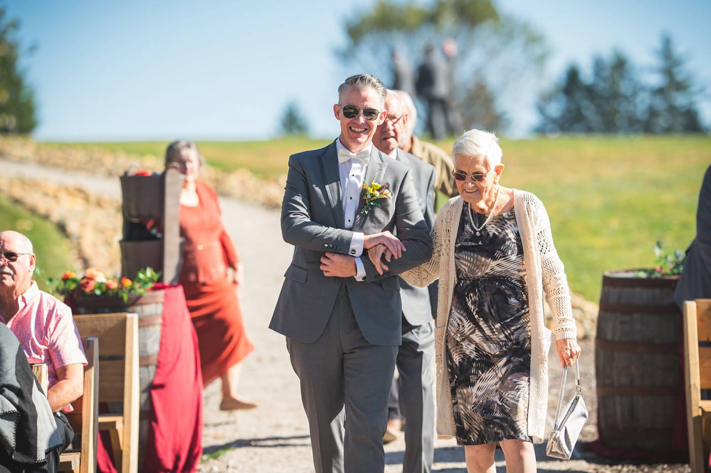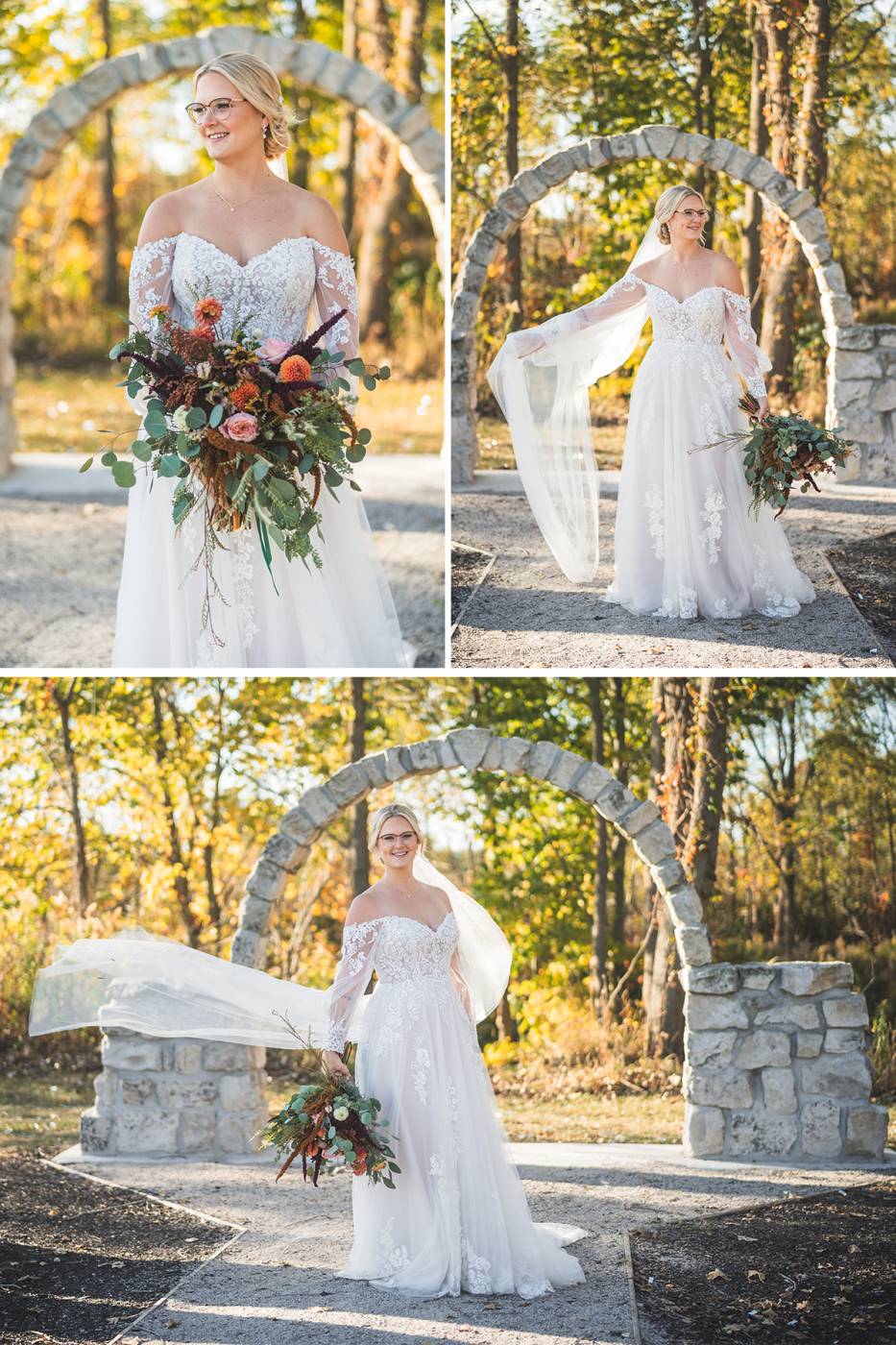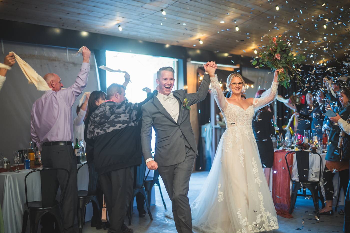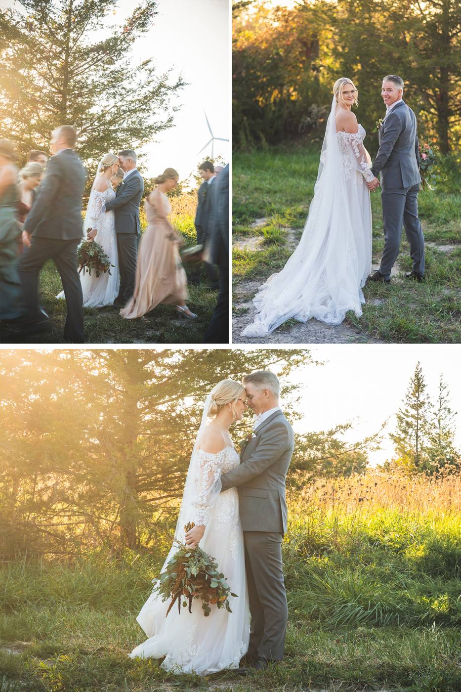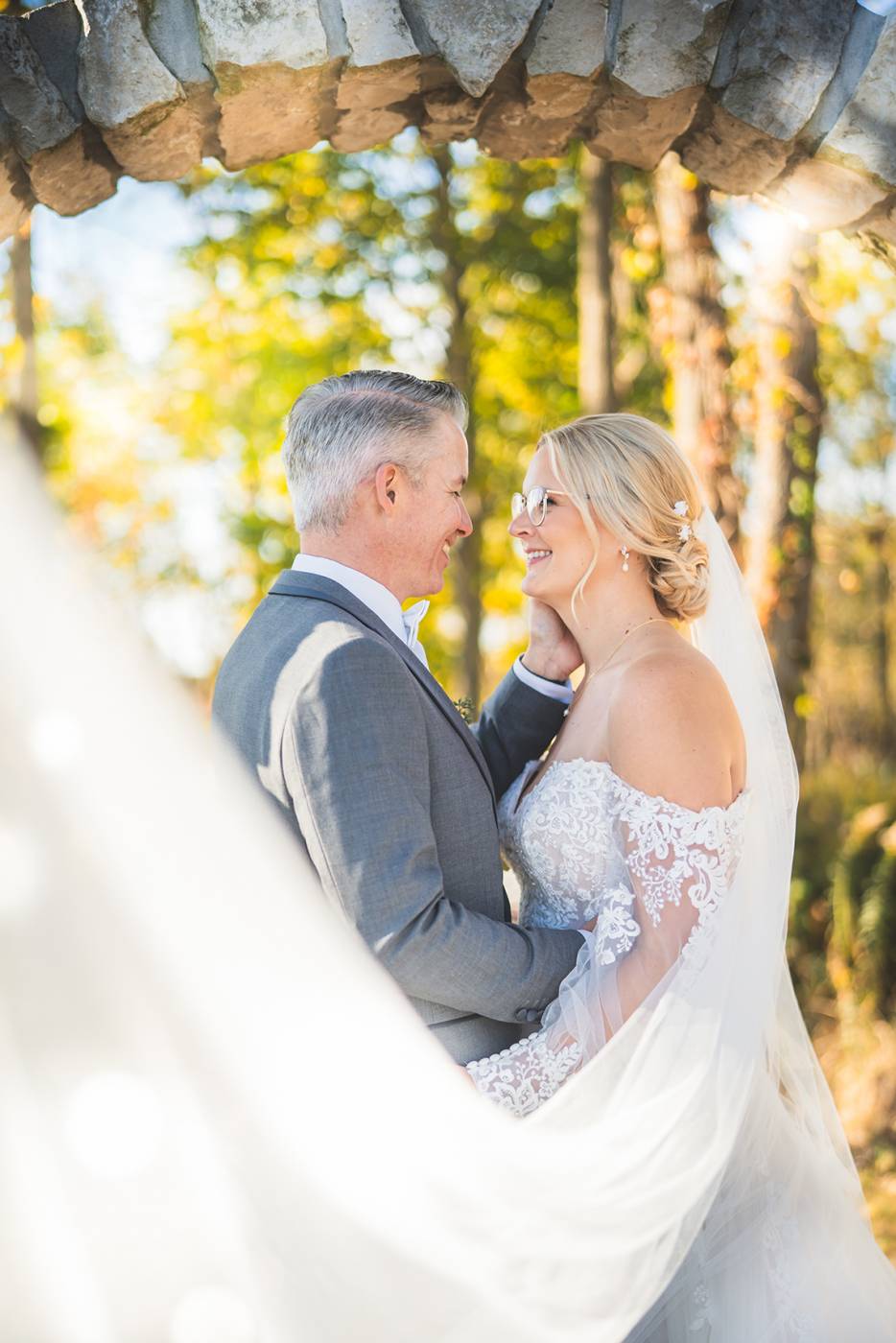 The outdoor ceremony, surrounded by the breathtaking colors of autumn, was made even more special with Kristina’s brother officiating. It was a picturesque scene, the warm sun casting a glow over the couple as they exchanged vows with their friends and family as witnesses. After the ceremony, the newlyweds took time for family photos and fun wedding party shots on the Timber Ridge property. In a unique and charming tradition, the groomsmen unearthed a bottle of whiskey they had buried a month before—a ritual meant to ensure good weather for the wedding, which turned out perfectly!
